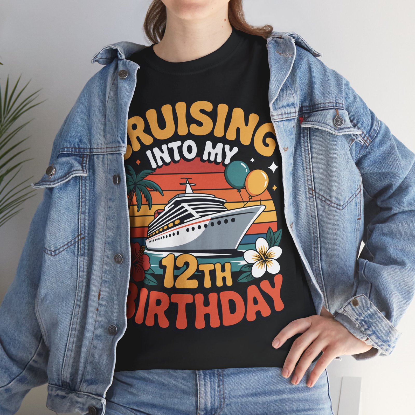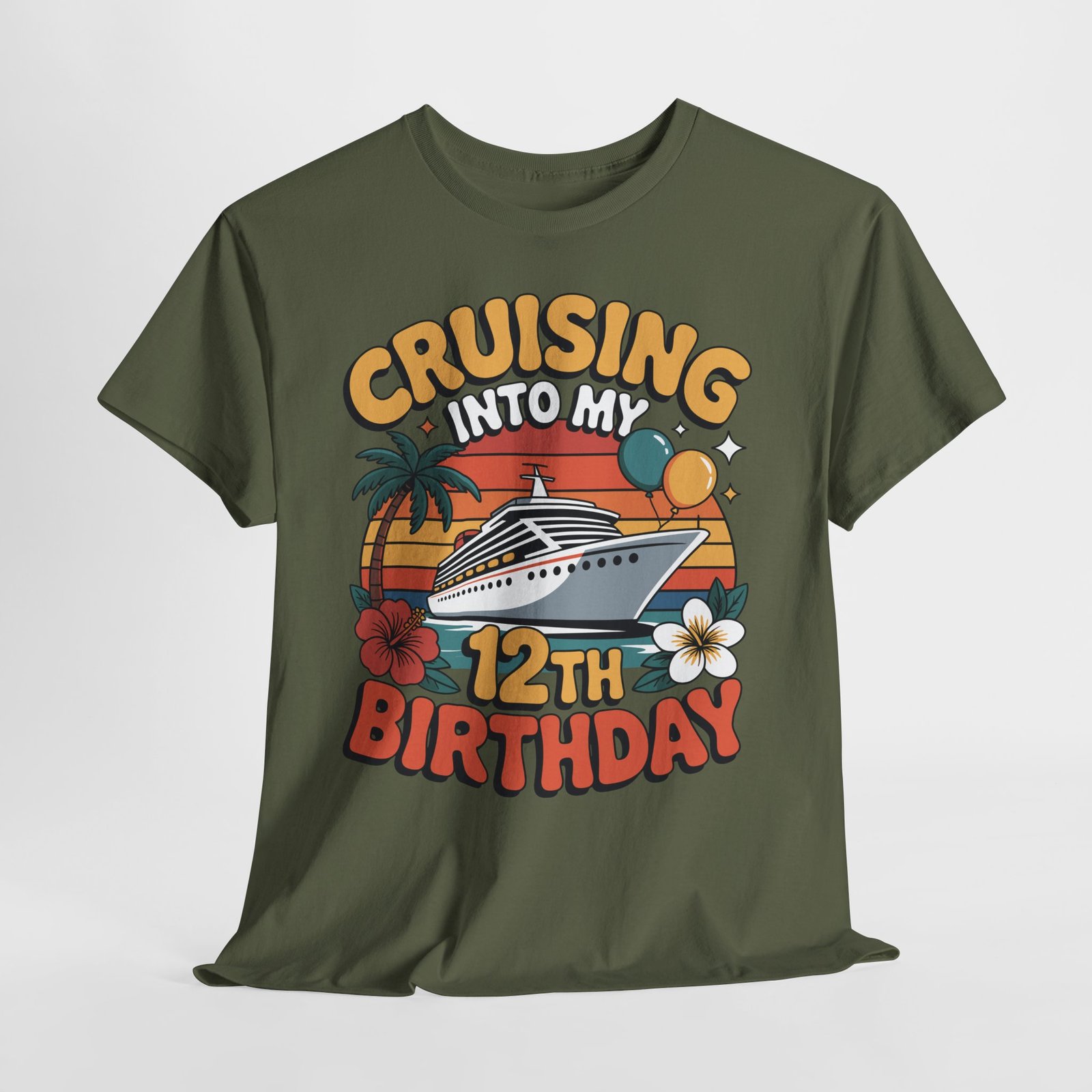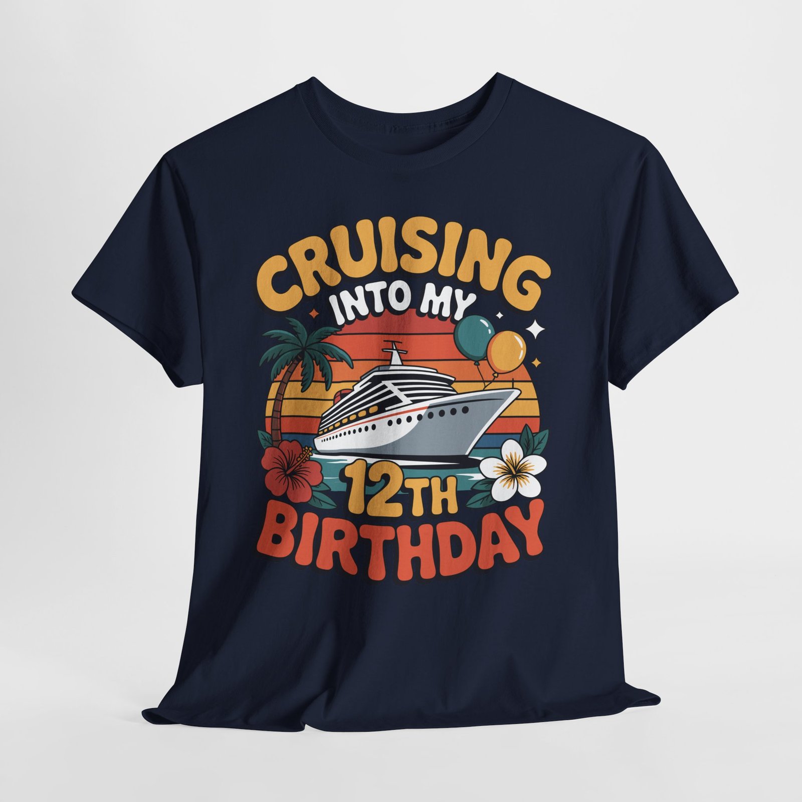 12th birthday cruise shirt lovers and families preparing a special birthday celebration at sea will appreciate the unique and vibrant style of this “Cruising Into My 12th Birthday” design. This shirt is specifically created for kids turning twelve during a cruise vacation and is ideal for parents searching for a memorable, fun, and colorful birthday cruise outfit. Featuring a bold cruise ship, retro sunset stripes, palm trees, balloons, hibiscus flowers, and bright colors, this shirt stands out beautifully in every cruise setting.