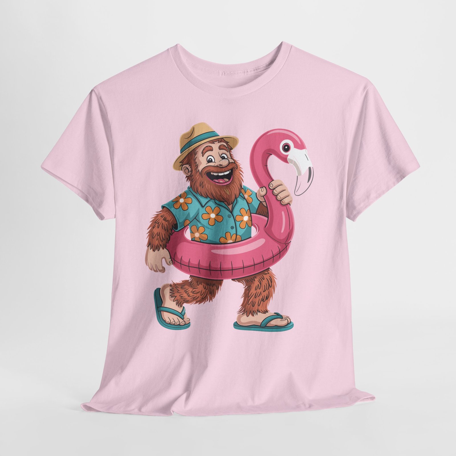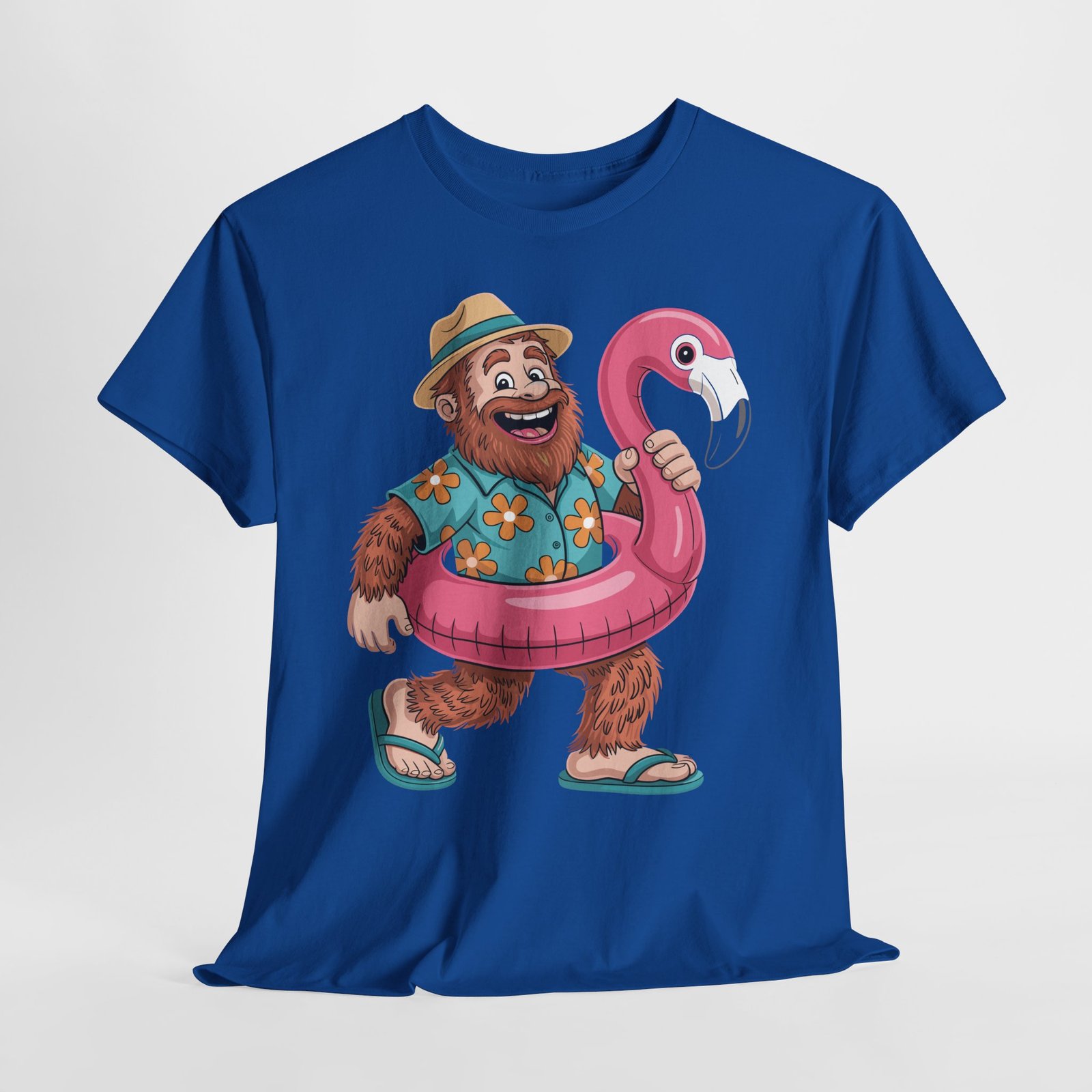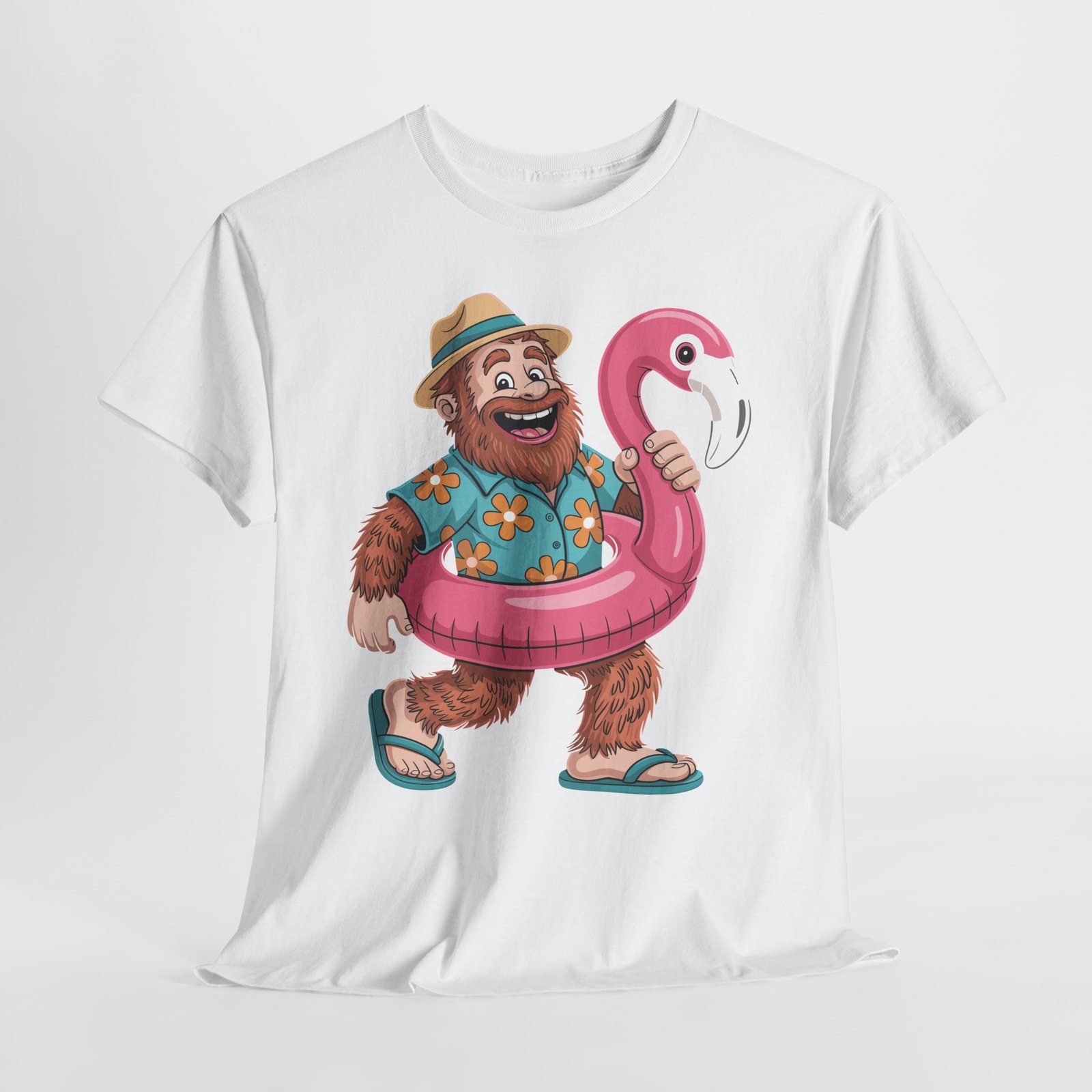 Printed with premium DTG technology on soft cotton, the shirt features sharp details, vivid colors, and long-lasting print quality. It holds up beautifully in warm climates, making it ideal for cruise ships, beach walks, poolside lounging, sightseeing, and tropical excursions. The artwork includes thoughtful details like the floral Hawaiian shirt, realistic fur texture, hat shading, and glossy flamingo float highlights.