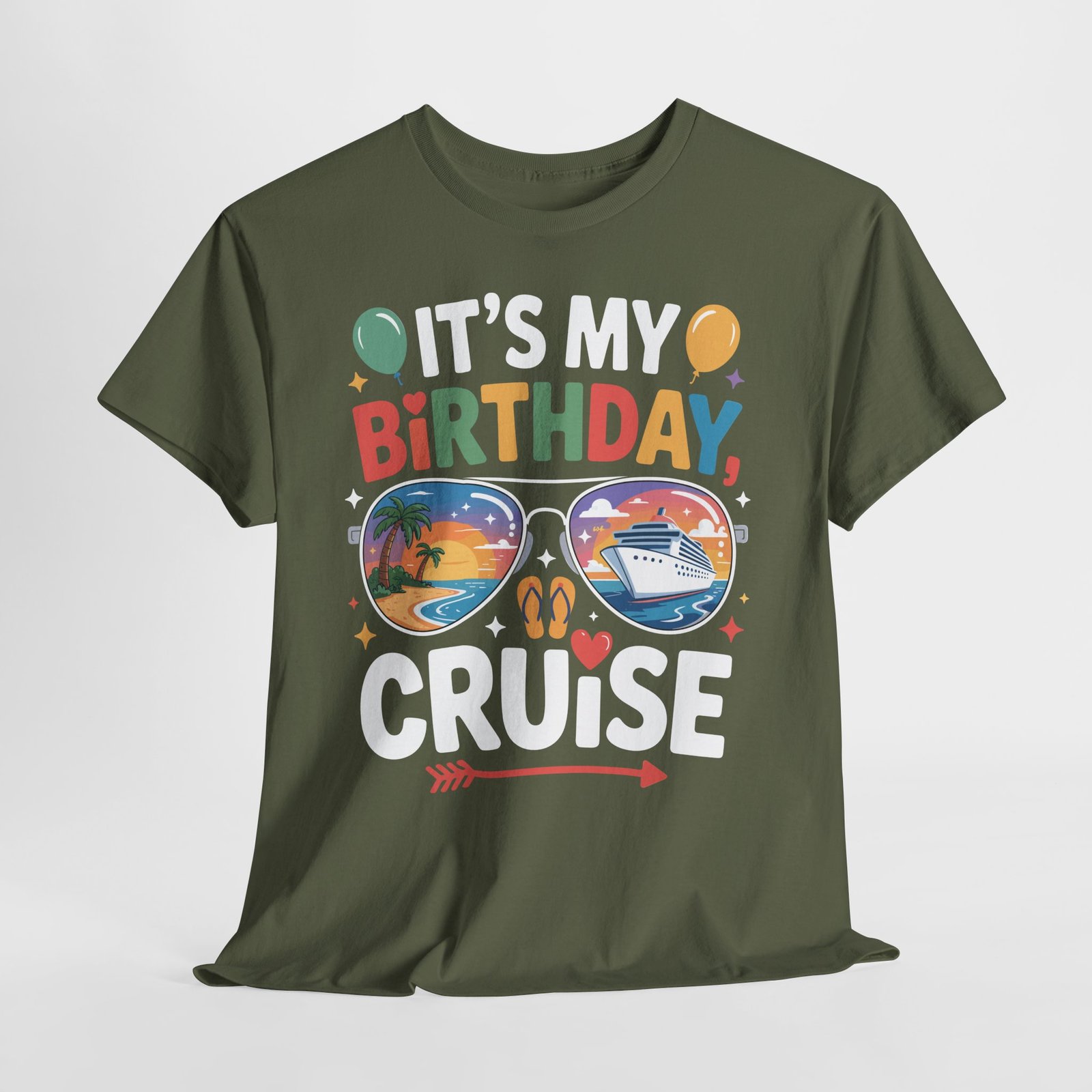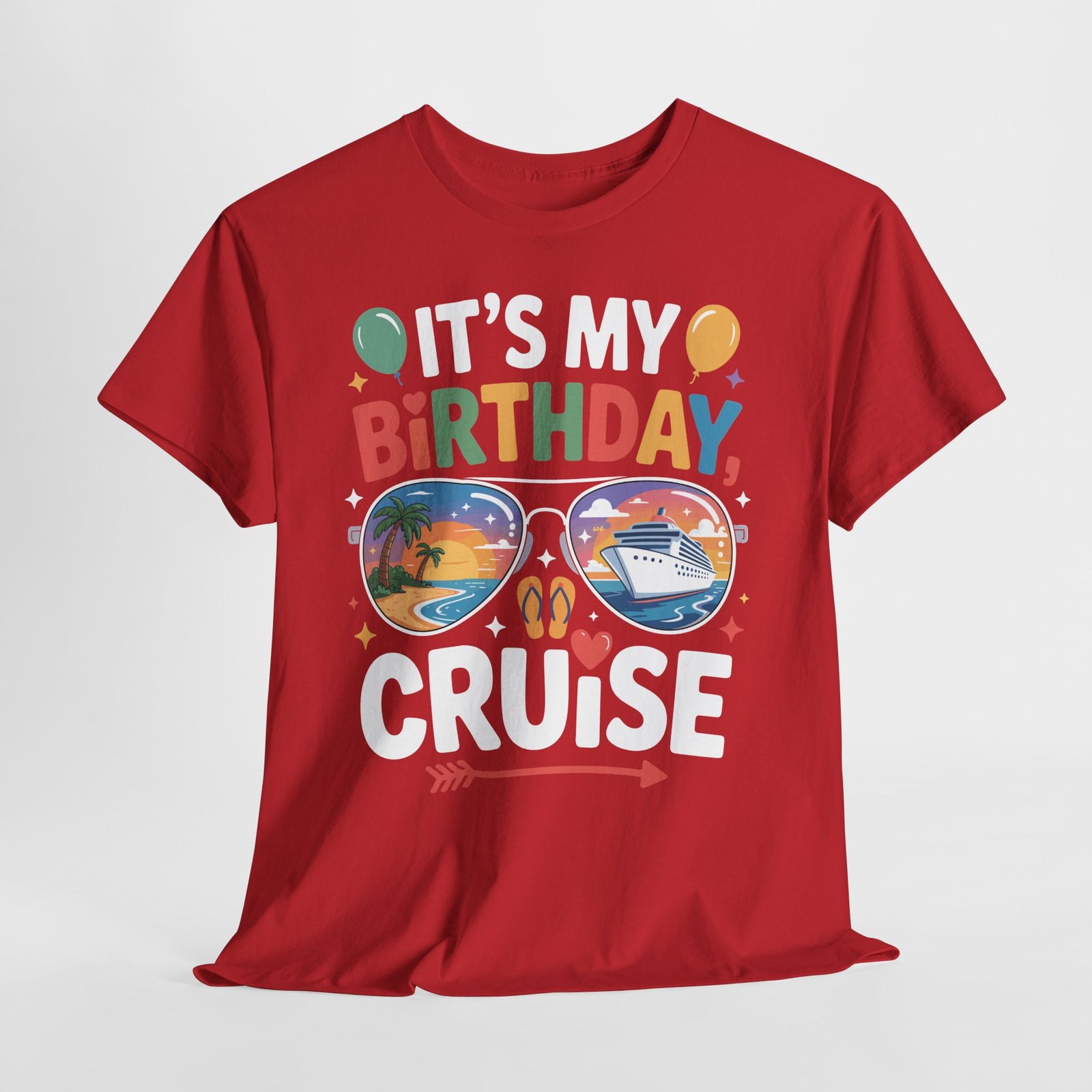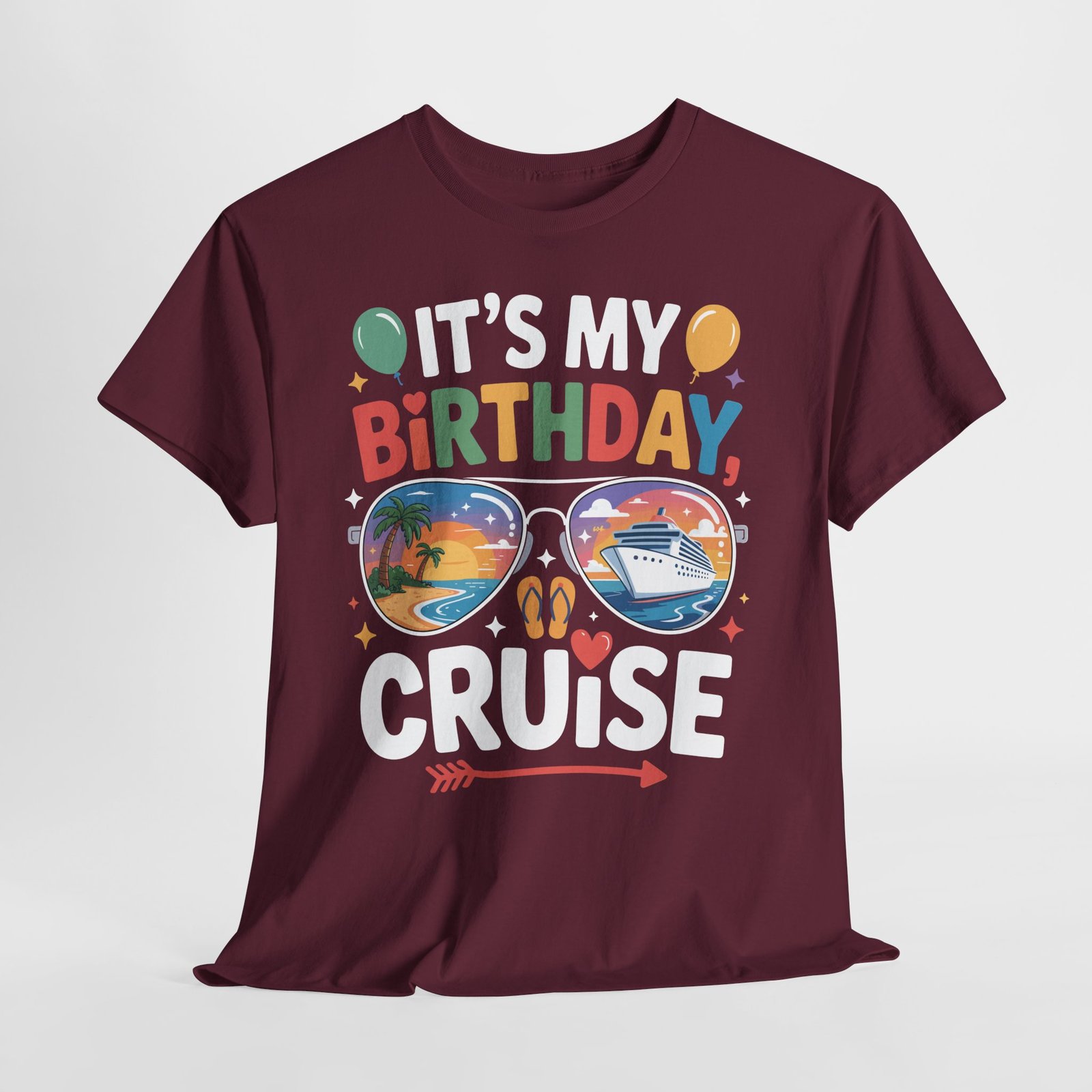 Are you ready to blow out the candles while sailing the high seas in style? There is no better way to celebrate another trip around the sun than with a luxury voyage, and our Birthday Cruise T-shirt is the essential outfit for your big day. Featuring a cool, 80s-inspired retro design, this shirt puts a unique twist on the classic vacation tee. The centerpiece features a pair of classic aviator sunglasses reflecting a breathtaking tropical sunset, a majestic cruise liner, and swaying palm trees—capturing the exact “vacation mode” vibe you want for your birthday.