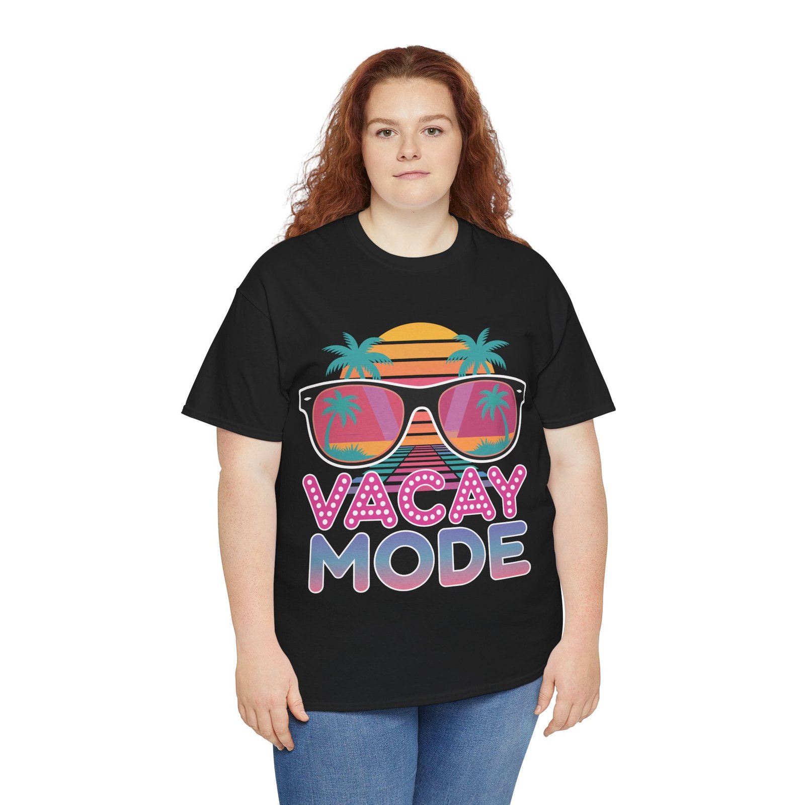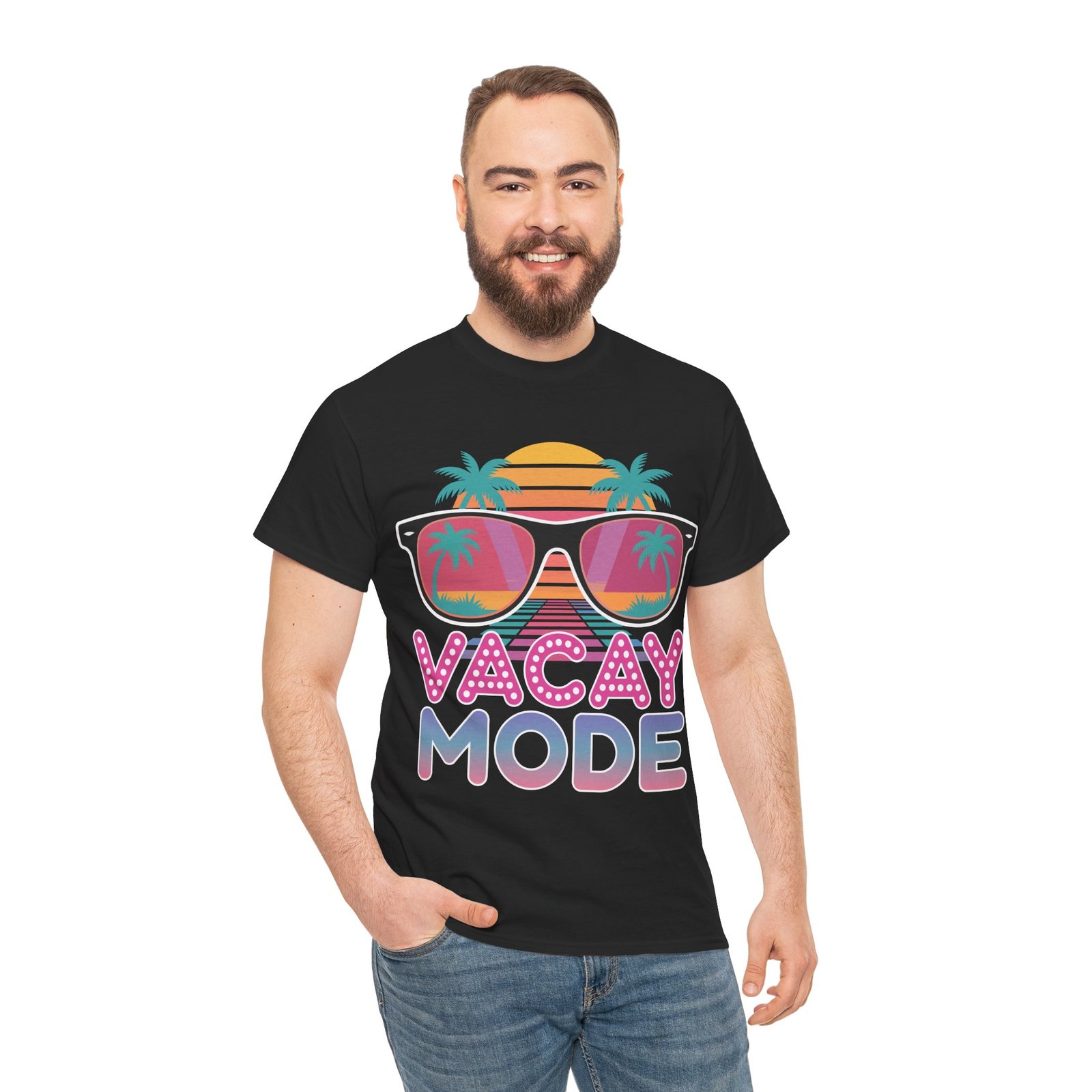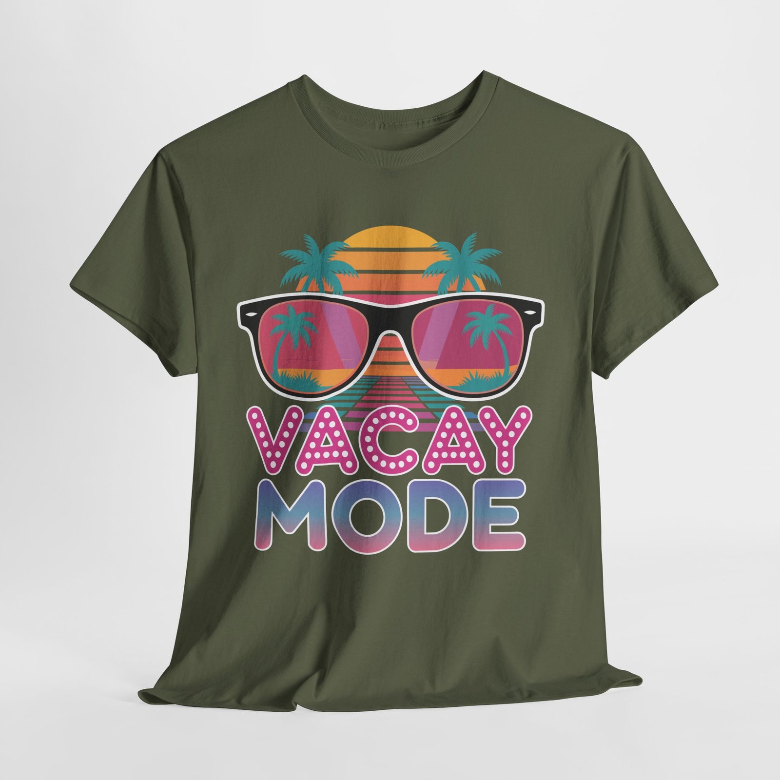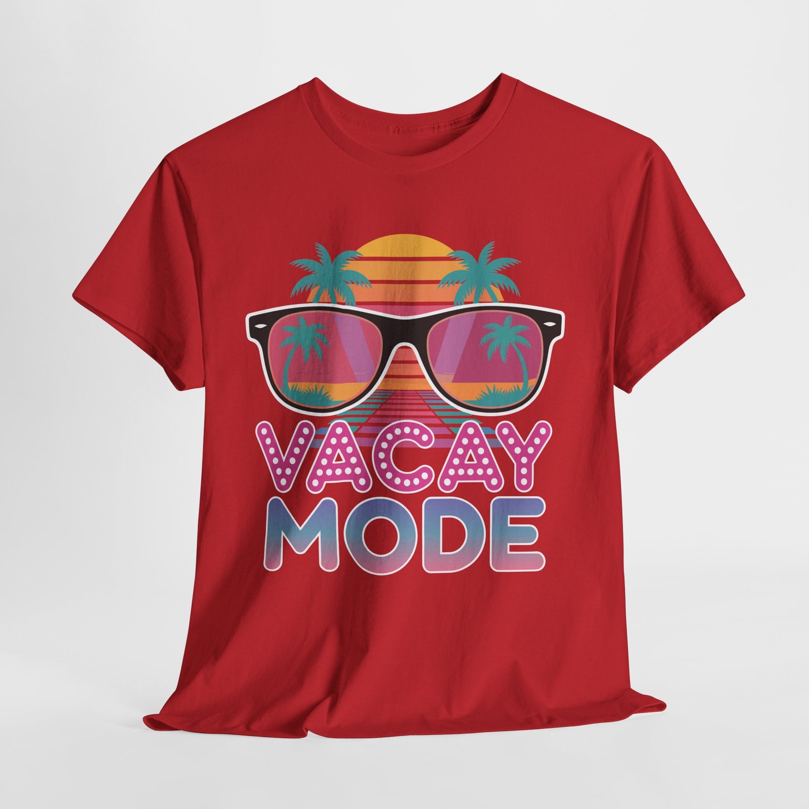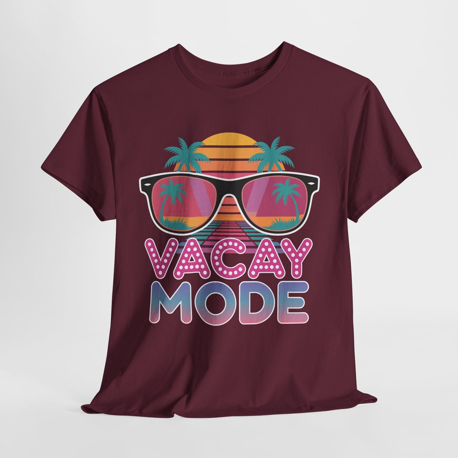 The combination of palm trees, a sunset horizon, and reflective sunglasses emphasizes everything people love about warm-weather travel: relaxation, sunshine, adventure, and the freedom of being away from daily routines. This vacay mode shirt expresses that feeling clearly and confidently, making it an essential pick for anyone who wants to embrace the vacation lifestyle and add a stylish touch to their next cruise or beach vacation.